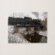 Locomotora de vapor que cruza un caballete en el invierno, dejando una reflexión nevosa en el agua abajo