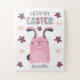 Rompecabezas de Pascua para los niños, con flores y un lindo conejito personalizado rosado. La leyenda dice Feliz Pascua. Personalizable con el nombre del niño.