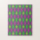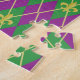 Un patrón de arlequín de verde y púrpura se transforma en un estilo lúdico con una superposición de contornos de diamante dorado y fleur de lis, creando un patrón divertido y colorido perfecto para cualquier celebración del Mardi Gras influenciada por Nueva Orleans.