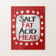 "Calor de sal de grasa de ácido" es un divertido diseño de texto con una forma de acento blanco rodeado de puntos blancos y brillantes en textura.