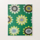 Patrón de margarita trabajado en ganchillo. Múltiples flores en tonos de amarillo con centros grises, marrones y beige, sobre fondo verde kelly.