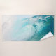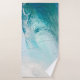 Toalla de baño con dos toallas y un paño de lavado con una foto de una ola de surf azul en el Océano Pacífico. El conjunto tiene una fuerte asociación de frescura, limpieza y relajación.