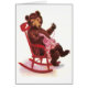 El oso de peluche que se sienta en una mecedora roja cose una ropa para uno de sus cachorros en este ilustracion del vintage de un libro de 1907 niños.