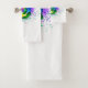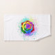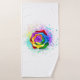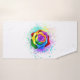 Rosa grande y floreciente con pétalos de arco iris sobre fondo blanco, pintado con salpicaduras de pintura colorida y brillante. 3.ª