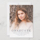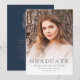 Esta invitación de graduación fotográfica muestra una foto del graduado con un texto superpuesto azul marino. La palabra "graduado" aparece en la tipografía de esquema decorativo. Añada a continuación el nombre del graduado, la escuela y el año de clase. En la parte trasera hay un elegante escudo vintage que rodea un polvoriento monograma rosa rosa inicial sobre un fondo azul marino, junto con un espacio de texto que destaca los logros y planes del graduado.