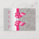 Tarjetas de respuesta personalizadas para bodas / invitaciones planas. Elegantes tarjetas de respuesta a doble cara de colores plateado y rosa intenso personalizadas con un hermoso patrón brillante de purpurina impresa, lazos y cintas de vectores impresos de rosa intenso brillante y diamantes de imagen impresa elegantes y con estilo, joyas con brillo y texto rosa intenso. Estas elegantes y glamurosas respuestas formales de rosa y plata están decoradas en ambos lados. Tarjetas dobles hermosas, chic, modernas y femeninas con brillo y glamour. Tenga en cuenta: todas las invitaciones en Zazzle tienen imágenes impresas planas. Tengo productos a juego para bodas en mi tienda. El texto, la fuente y los colores de la fuente son personalizables para satisfacer sus necesidades. Si necesita ayuda para personalizar su producto, por favor contácteme a través de mi tienda. Estaré encantado de ayudar. POR FAVOR TENGAN EN CUENTA