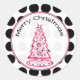 Un pegatina con fondo de un punto de polka negro. El ilustracion dentro del círculo es de un árbol de Navidad con un esquema de color rosa. El árbol de Navidad presenta luces rosas y adornos de puntos de polka coincidentes, estrella y falda de árbol. El texto de arriba dice "Feliz Navidad".