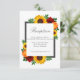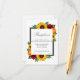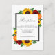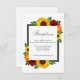 El diseño cuenta con elegantes girasoles, rosas y flores silvestres con una paleta de colores dorados amarillos, rojos y naranjas. El diseño también incluye un marco gris de carbón vegetal. Puede cambiar el color de fondo en la parte delantera y de vuelta al color de su elección o dejar ambos en blanco.