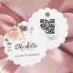 Un fondo blanco moda. Decorada con rosa de oro y floral rosa, flor (rosa) y hojas de eucalipto de color verde acuático y verde, brotes, vegetación y una falsa primavera dorada. Personalice y agregue su nombre, letras en monograma y nombre completo. Letras negras y doradas. Atrás: código QR en tu sitio web o en los medios sociales, texto.