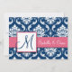 Invitaciones elegantes de la boda en formato rectangular con el modelo del damasco de los azules marinos y del blanco, monograma, nombres con colores de acento rosados. Diseño de la invitación de la boda de Elke Clarke ©2009. Gráficos autorizados para el uso. Personalizar con su monograma, nombres e información de la invitación del boda. ¡También, elija de una variedad de fuentes y de papeles hermosos hacer sus invitaciones del boda FABULOSAS! Éntrenos en contacto con para las alteraciones en colores en luxuryweddinginvitations@gmail.com
