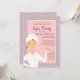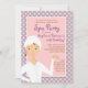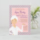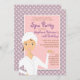 Un chica marrón-observado bonito está consiguiendo una manicura mientras que snuggled en su traje blanco de la felpa por un día de cuidar en exceso en el balneario. ¡Una gran idea de la fiesta de cumpleaños para las adolescencias, los 'tweenes y los graduados! En rosa en colores pastel y púrpura bonitos de la lila con los lunares blancos.