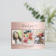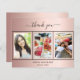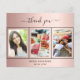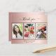 Un glamoroso cumpleaños 21 (o edad andy) Gracias tarjeta personalizada con tu propia foto. Añade 3 fotos de tu cumpleaños, tamaño vertical, una fecha, nombre y la nota de agradecimiento. Un fondo de diseño de color rosa de oro falso metálico con texto negro y marco. El texto: Gracias en la parte delantera y sus nombres en la parte trasera están escritos con un elegante guión con letras a mano con guiones.