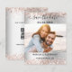 Una boda moderna Salven la tarjeta de foto de la fecha. Un fondo de imitación plateada decorado con un confetti dorado rosa. Personalice y agregue su foto, detalles del boda y su propio código qr a su sitio web boda. Esta tarjeta está disponible en nuestra tienda sin el código QR en la parte posterior.