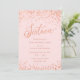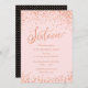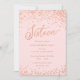 Invitaciones a la fiesta de cumpleaños del Rosa Gold Sweet 16: Confeti de oro rosa Bonito diseño de fiesta de 16º cumpleaños con brillantes puntos de polka de Relieve metalizado rosa de oro. Oro Rosa "Dieciséis" escrito en tipografía manuscrita. Las letras contemporáneas rellenan los detalles del fiesta. [Tenga en cuenta que mientras los elementos de este diseño se imprimirán para que parezcan Relieves metalizados, no se utiliza ningún Relieve metalizado real o tinta metálica para crear las invitaciones - el Relieve metalizado de oro rosa es un efecto impreso.]