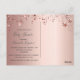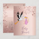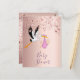 Elegante, clásico, glamuroso y de estilo jovial, invitación a la ducha de bebé para celebrar a una niña. Caída, brillantes estrellas de oro rosa y una cigüeña voladora, pájaro sosteniendo a una niña. Rosa de oro fino fondo metálico. Con el texto: Baby Shower en el frente escrito con un moderno guión de estilo con letras moradas de color púrpura. Añade los detalles del evento en letras de color gris oscuro.