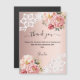 Fondo Subió de gradiente dorado. Decorado con rosas rosas rosas rosas, flores y encaje. Guión con letras a mano grande con barras y el texto: Gracias. Personalice y agregue nota de agradecimiento y nombre.