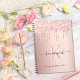 Un falso fondo metálico de color dorado rosa con elegantes goteos en purpurina de rosa y de imitación rosa, pinturas de goteo. Personalice y agregue un nombre, una letra monográfica y un título. El nombre está escrito en burdeos con un gran guión de estilo moderno con letras a mano con chispas. Perfecto para la escuela, el trabajo o como tu diario secreto. Para que los cambios sólo eliminen el nombre del ejemplo, deje los espacios o la emoji delante y después del nombre.