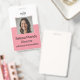 Placa vertical rosa personalizada con foto y nombre del empleado, texto personalizable para número de identificación del empleado, rol, título, ubicación u otros detalles clave. Agrega el logotipo de tu empresa en la parte superior. La parte posterior de la placa incluye un campo de texto personalizable para información de devolución u otros detalles importantes.