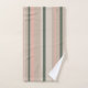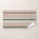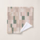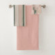 El cuarto de baño es de color rosa y beige. La toalla de baño es sólida en rosa rubor, la toalla de mano tiene rayas clásicas de beige, verde y rosa, y la tela de cara tiene la impresión de un bloque de color en los mismos tonos.