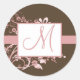 Pegatinas de la boda del monograma con un fondo floral marrón y rosado del remolino. Consiga el franqueo a juego para terminar la mirada.