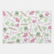 Una toalla de cocina que ofrece un diseño temático de cocinar que consiste en los mezcladores de la mano, mitones del horno, cuchara de madera, rodillos, espátula, bate, y estufa retra. El diseño tiene un esquema de color rosado y verde.