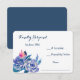 Esta tarjeta RSVP incluye una imagen de ramo de rosas azules, con una flor violeta rosa complementaria, y hojas azules y acuáticas. El texto de su personalizado es azul. La imagen y el texto se colocan en un fondo blanco. La parte posterior de la tarjeta es azul. Asegúrese de ver los productos bodas correspondientes, incluidas las invitaciones, en nuestra tienda.