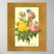Reproducción antigua de rosas botánicos rosados y amarillos con mariposas azules sobre un fondo de pergamino de imitación gris marrón. Las flores están listadas en la obra de arte; rosas amarillas persas (rosa Lutea) y rosas rosados (rosa indica). Enmarcado con elementos de manuscritos antiguos.