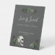 Esta elegante señal de mesa de favores de ducha de boda del día de San Patricio irlandés gótico presenta ilustraciones temáticas irlandesas y góticas dibujadas a mano en tinta negra, mostrando una calavera adornada con rosas verdes, hojas, bayas, flores silvestres y tréboles. La parte posterior presenta un patrón coincidente con estos mismos elementos contra el mismo fondo rosa.