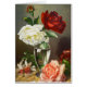 Ilustración botánica antigua de diseño natural con rosas de jardín blancas, rosadas y rojas floreciendo en un jarrón de vidrio transparente.