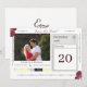 La parte frontal del diseño muestra la foto que se suministra como imagen principal. La fecha de boda se muestra claramente en el calendario de simulación. El encabezado se muestra en un tipo de letra nupcial elegante en el centro superior. El símbolo tradicional de la cruz y los anillos aparece en la esquina superior derecha del calendario. La imagen de rosas encantadores adorna las esquinas, añadiendo un toque suave. El fondo es blanco. Las iniciales de las características inversas de la pareja se unieron en el mismo tipo de letra nupcial elegante que el encabezado. A continuación se muestra la información del registro de novias. El color de fuente es un rosa de color burdeos. También disponible en fuentes de color plateado. Diseñado para coordinar con la suite Boda católica de Rosas finos.