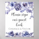 Un elegante borde floral de rosas púrpura de acuarela enmarca este cartel de boda invernal chic que dice "Por favor firme nuestro libro de invitados" dentro de las hermosas flores violetas y hojas botánicas de lavanda. Perfecto letrero personalizado para libro de invitados.