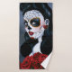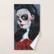 Una sorprendente fusión de belleza y simbolismo, esta obra de arte presenta a una mujer glamorosa adornada con un intrincado maquillaje de calavera de azúcar, enmarcada por cabello negro intenso y rosas rojas vívidas. Inspirada en las tradiciones del Día de los Muertos, sus delicados detalles de red, pendiente en forma de corazón y labios rojos atrevidos crean una presencia elegantemente inquietante que equilibra vida, amor y recuerdo. Perfecta para los fanáticos del arte gótico y la estética oscura romántica