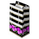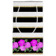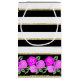 Cuenta con un bonito borde rosa rosa rosa brillante y un patrón de rayas horizontales en blanco, negro y oro.