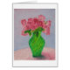 Estos rosas intoxicatingly fragantes vinieron de un arbusto color de rosa que subía en la floración perfecta en un día soleado de junio en Chicago. Este poster fue creado de mi pintura al óleo original, que destaca los rosas con pesado, uso altamente texturizado de la pintura en varias sombras del rosa y el rojo. Los movimientos amarillos mezclaron en la indirecta del florero en los troncos de los rosas mientras que sugerían la sol de la media tarde que filtró a través del vidrio verde cuando esta pintura fue creada. Los tactos del rosa en el fondo de la lavanda así como los movimientos gruesos de rosa claro en la parte posterior de la tabla, del verde a la derecha del florero, y de un rosa más oscuro en la ayuda del primero plano armonizan y unifican este pedazo porque repiten los colores en las flores y el florero.