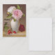 Rosas rosas claros en un florero blanco. Un rosa rojo y los escaramujos se sientan en la tabla en esta tarjeta del comercio del victorian a partir de los 1800s.