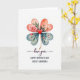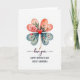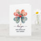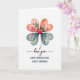 Esta tarjeta presenta un trébol de cuatro hojas hecho de cuatro hojas en forma de corazón centradas en un fondo blanco brillante, lo que le da al diseño un aspecto suave y afectuoso ❤️. Las dos hojas superiores en forma de corazón se desvanecen a través de tonos rosados y coral suave, mientras que las dos hojas inferiores se desplazan hacia tonos azules-verdosos tranquilos como el vidrio marino fresco. Dentro de cada hoja en forma de corazón, flores y follaje de estilo acuarela se despliegan, sugiriendo cuidado y cercanía a través de sus formas suaves y pétalos recogidos. El corazón superior izquierdo sostiene una rosa rosa completa con acentos frondosos, y el corazón superior derecho muestra flores delgadas como lirios con algunas puntas en brote que se inclinan hacia adentro como si estuvieran en un intercambio silencioso. Los corazones inferiores llevan rosas más pequeñas y hojas delicadas, equilibrando los detalles tipo bouquet a través del trébol y agregando un toque tierno y de jardín familiar 🌼. En el centro donde se encuentran los cuatro corazones hay un pequeño corazón rojo rubí, con un tallo dorado delgado que cae recto hacia abajo debajo de él. Debajo de la ilustración, las palabras “te amo” aparecen en una fuente oscura y fluida, seguidas de “FELIZ DÍA DE