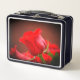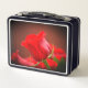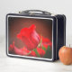 Esta caja de almuerzo tiene algunas rosas rojas retratadas en ella.
