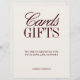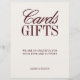 Bienvenido a sus huéspedes con este elegante cartel de tarjetas y regalos de color burdeos, perfecto para guiarlos a su mesa designada. Diseñado con un fondo de color rojo intenso y una refinada mezcla de serif y escritura tipográfica, este signo combina sofisticación con practicidad. Un detalle cuidado para bodas formales, recepciones de viñedos, celebraciones de otoño o ceremonias nocturnas, añade estilo y función a su decoración. Personalizable completo: personaliza con tus nombres, fecha de boda o texto personalizado para que se adapte a tu evento. Se coordina a la perfección con el completo paquete de papel boda "Sabrina" para un aspecto cohesivo y atemporal.
