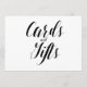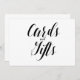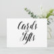 Sencillo y elegante símbolo de caligrafía en blanco y negro "Tarjetas y Regalos" boda. Este cartel boda de "Tarjetas y Regalos" se ve muy bien impreso en un papel mate, si necesitas algo más tradicional, usa el Laid, la Linen o la Columned, para un ambiente rústico usa el Artesano Kraft, si quieres añadir un toque de glam, usa el Luxe. Al hacer clic en el botón "personalizar", puede acceder a la herramienta de edición y elegir un color de fondo diferente. Este es un signo de tarjeta plano impreso de 5" x 7", se verá realmente elegante en un marco de imagen.