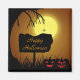 Una silueta ilustracion de Halloween: Aterrador paisaje negro con un árbol y una araña frente a la luna llena, un cartel y dos calabazas de halloween; todo sobre un fondo naranja.
