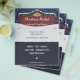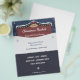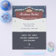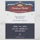 Anuncio de volante para un mercado de Navidades local en la parte superior, un cartel de madera, cubierto de nieve y decorado con burbujas y un arco rojo, todo con un fondo azul oscuro. En el centro y en el fondo, hay lugares para la información de personalizables y algunos copos de nieve. También se puede utilizar como invitación a la fiesta o a la cena.