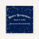 Fiesta de jubilación firma en el libro de invitados con el nombre del jubilado afortunado, fecha de jubilación y texto Feliz Jubilación. El diseño de fondo son estrellas doradas en un fondo azul oscuro.