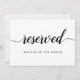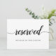Indique los asientos reservados en su boda con este signo de moda 5x7. Personalice con dos líneas de texto personalizado en escritura caligráfica y letras de bloques modernas (mostradas con "Reservado" y el nombre del invitado con asientos reservados) en negro crujiente sobre un fondo blanco.