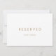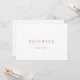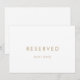 Este signo de reserva de tipografía dorada de moda es perfecto para un boda moderno. La tarjeta tiene doble cara (impresiones en ambos lados). El diseño es sencillo y presenta una tipografía minimalista clásica de oro y blanco con un ambiente rústico de boho. Personalizable de cualquier color. Mantenga el diseño minimalista y elegante, tal como está, o lo personalice añadiendo sus propios gráficos y obras de arte. Utilice estas tarjetas para reservar sillas o mesas en su ceremonia boda, recepción o cualquier evento.
