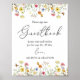 Hermosas flores silvestres y mariposas acentúan la parte superior e inferior de este cartel boda de libro de visitas. El "libro de visitas" está audazmente impreso en un guión elegante. El poster se puede ver en una mesa de recepción para animar a los bodas a firmar su libro de bodas.