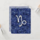 Un símbolo de zodiaco cromado plateado como Capricorn sobre un fondo de impresión de textura de diseño de estilo azul marino. Un moderno diseño de racia urbana para una gran idea de regalo de cumpleaños personalizado.