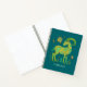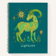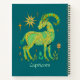 Diario en una estilizada representación de una cabra, intrincadamente decorada con patrones de verde y amarillo, representando el signo zodiaco Capricornio. Los elementos que lo rodean incluyen símbolos celestes y diseños de hojas.