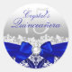 Pegatina Real Azul Quinceañera. Elegante diseño de damasco azul y blanco con arco de seda perla. Personalizar con sus propios detalles. Atención: todas las imágenes planas. ¡No tienen arcos, encajes ni joyas de verdad!