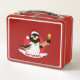 Lunch box with an illustration of cute little royal penguin holding a scepter and wearing a red Santa hat; Christmas holiday cartoon design for kids