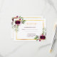 Una elegante tarjeta RSVP para un boda con plantillas para responder por fecha, nombres, etc. Un marco de oro falso con rosas bohemias, de estilo boho acuático, flores en burdeos. Fondo blanco, letras de color burdeos y dorado. Regreso: Nombre de la novia y del novio y fecha del boda.